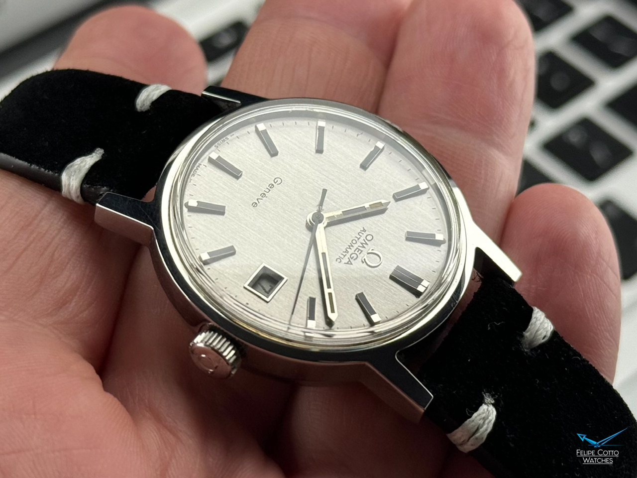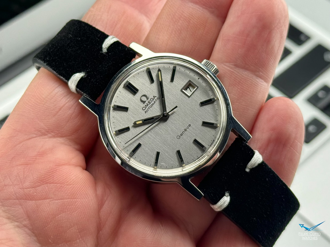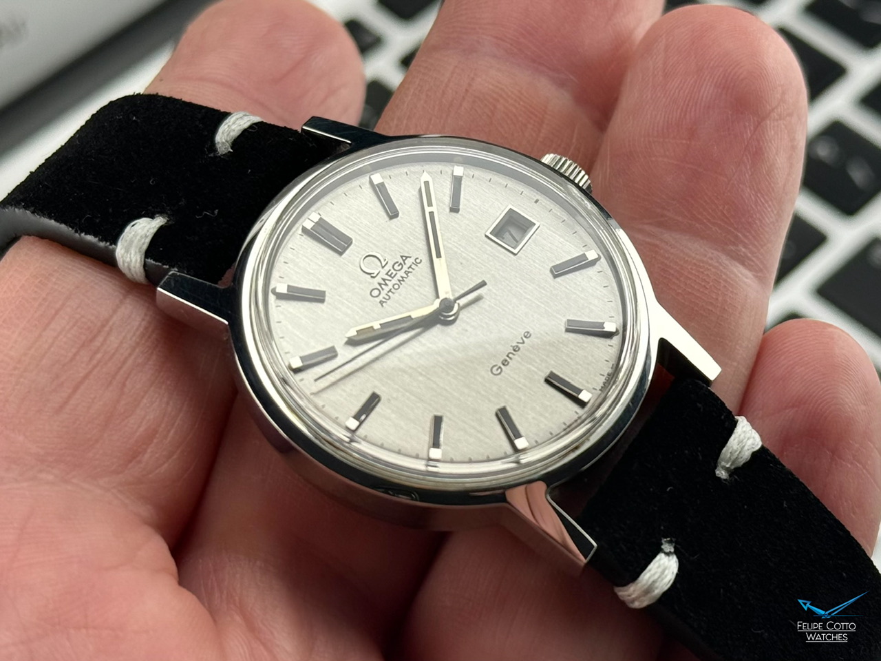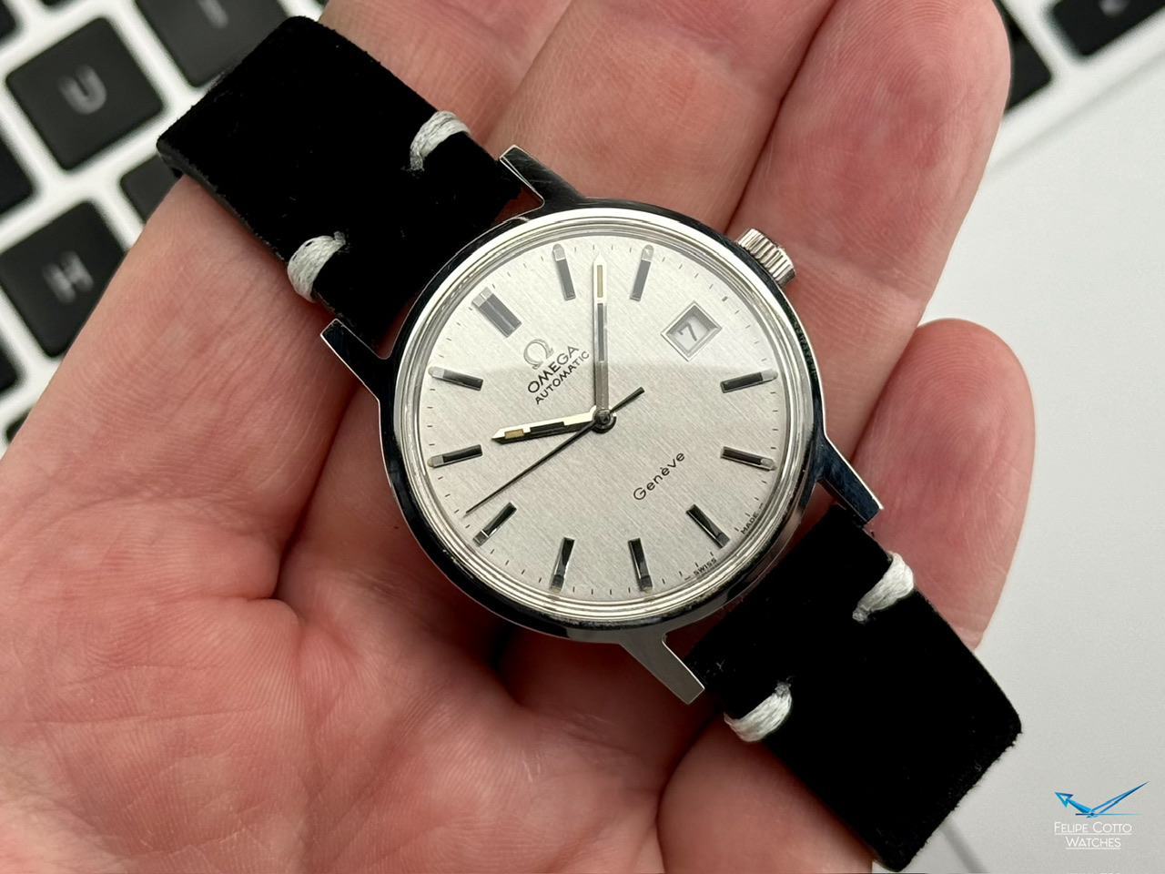 Piekna srebrna tarcza z nakładanymi indeksami i pionowym szlifem w niemal idealnym stanie.