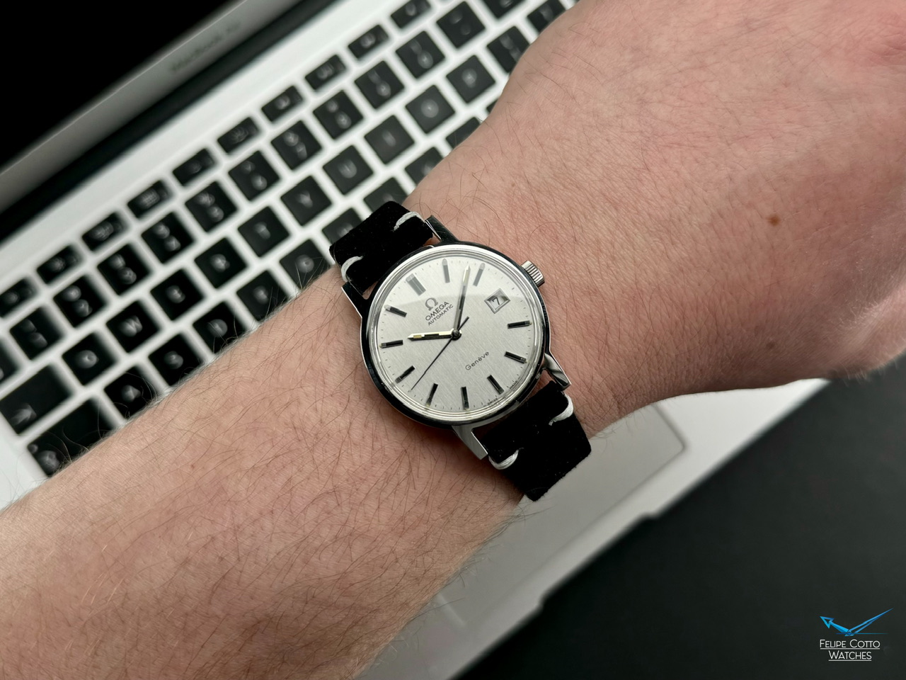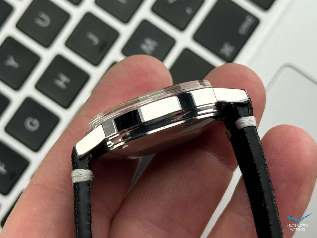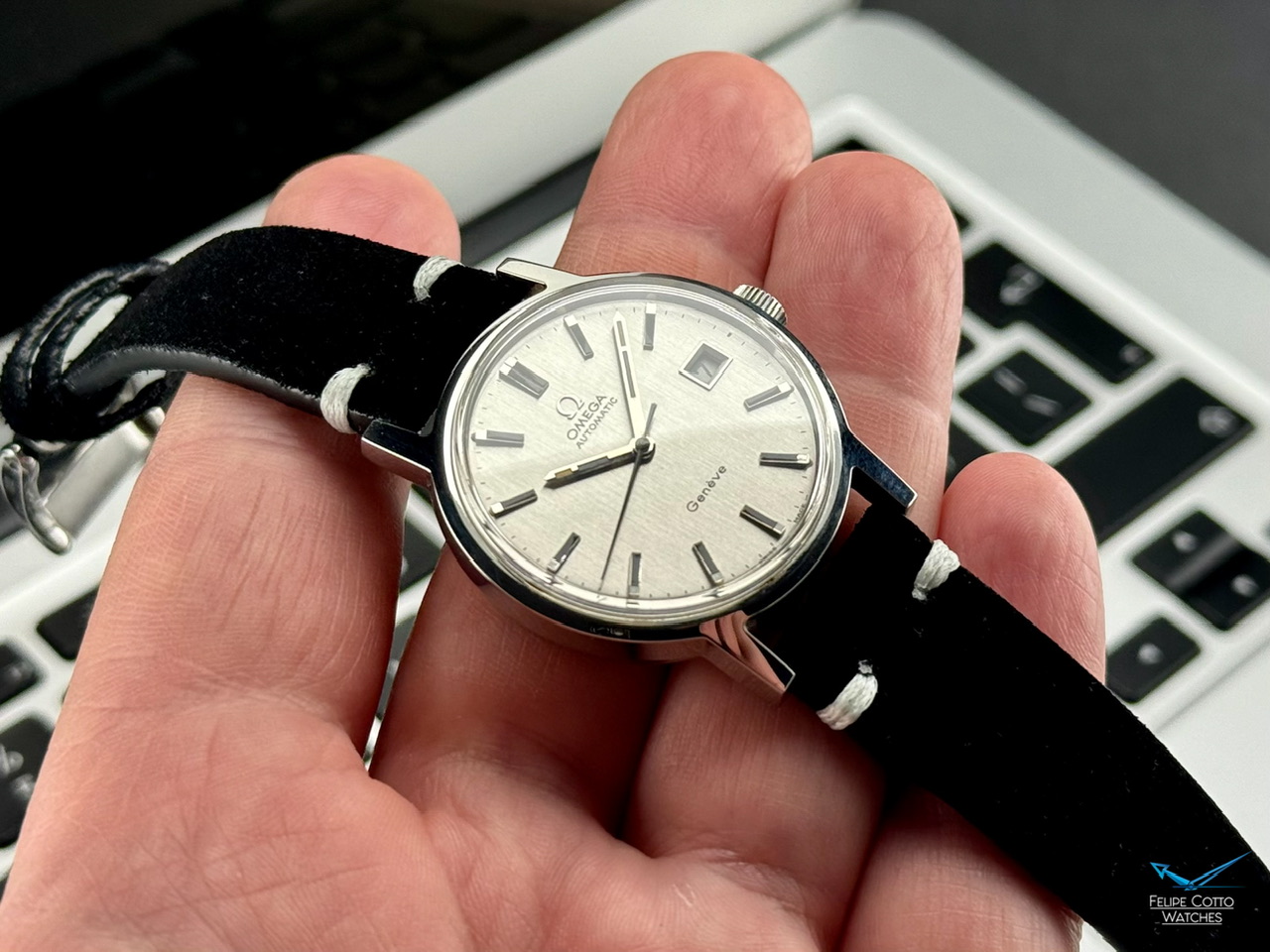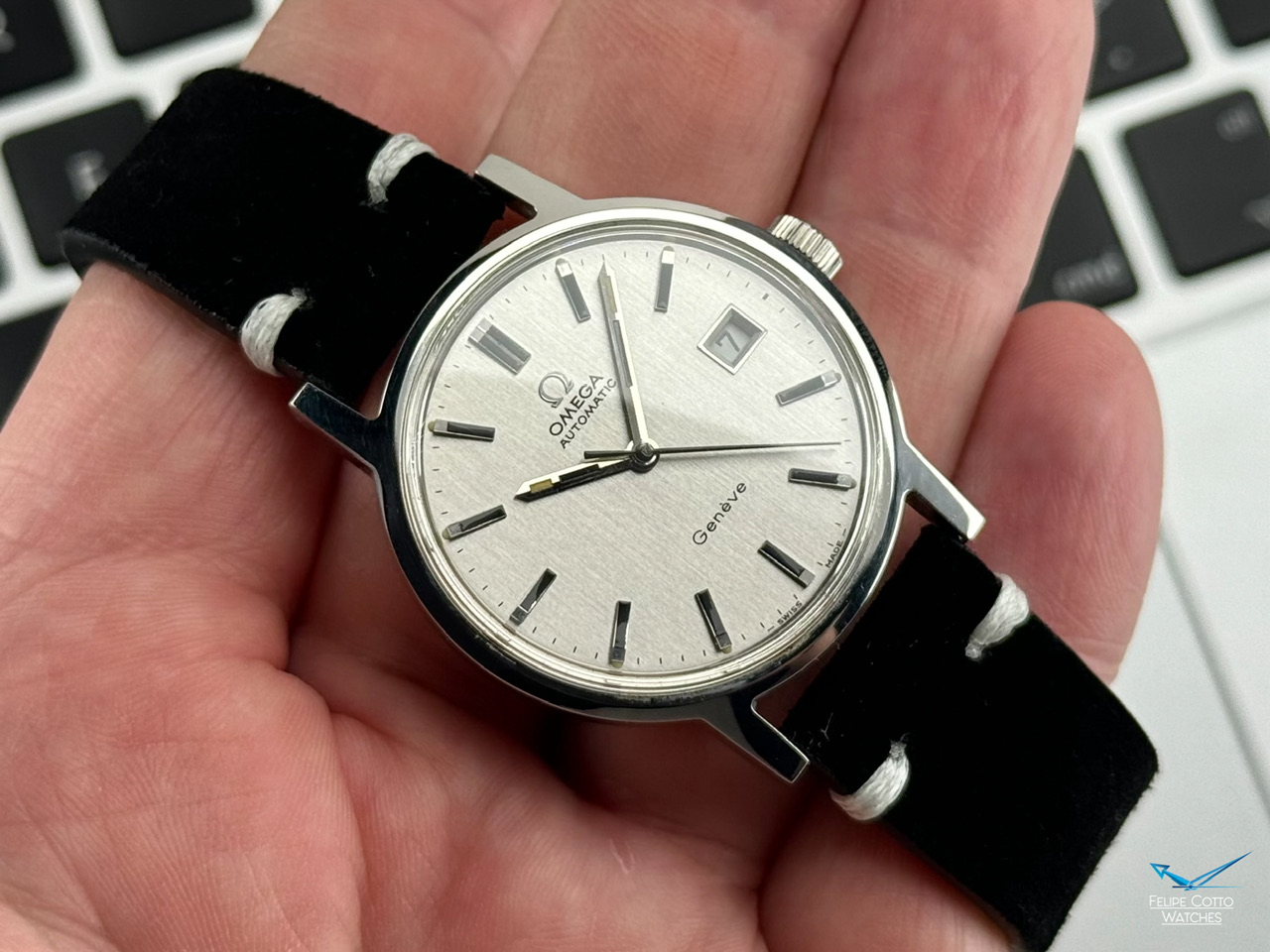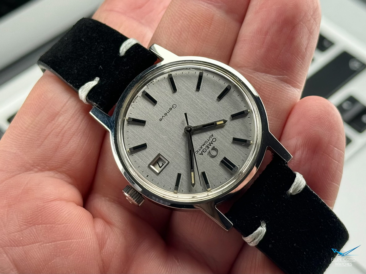 Piekna srebrna tarcza z nakładanymi indeksami i pionowym szlifem w niemal idealnym stanie.
