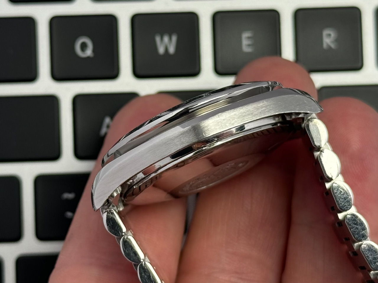 Koperta stalowa w rozmiarze 39mm nie licząc koronki. Zachowana w dobrym stanie z normalnymi śladami używania. Bezel bez ubytków.