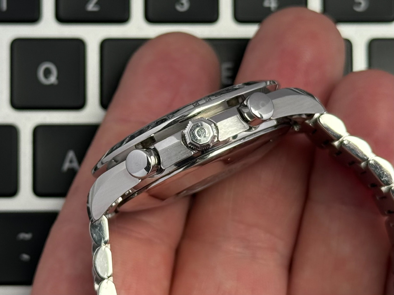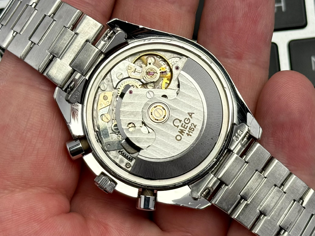 W środku mechanizm automatyczny cal. 1152. Całkowicie sprawny, na dobrym chodzie (ostatnie zdjęcie), funkcje chronografu działają bez zarzutu, jednak z nieznaną historią serwisową.