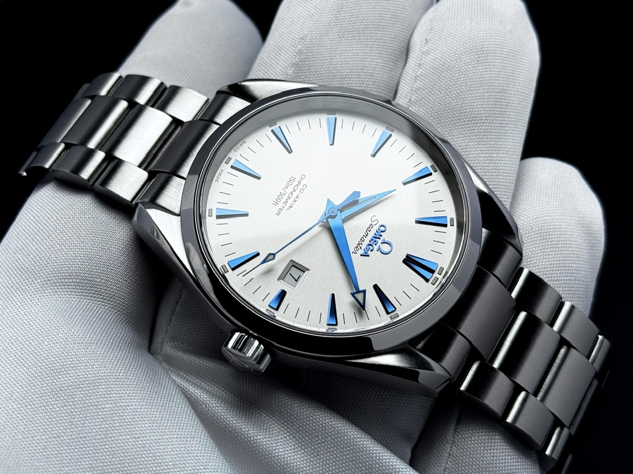 Kontrastujące niebieskie wskazówki i indeksy.