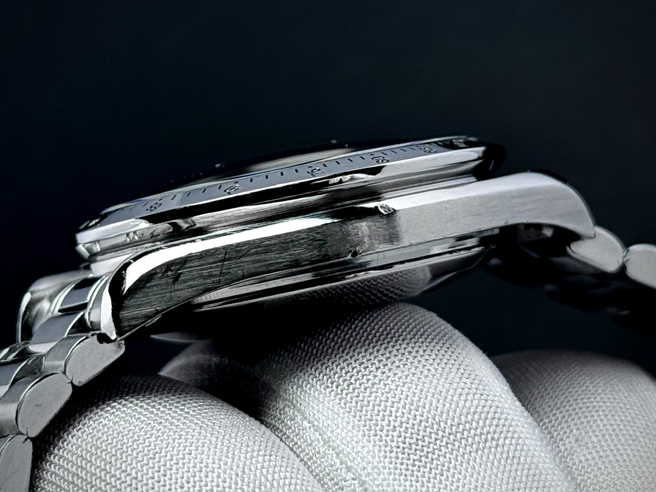 Koperta stalowa w rozmiarze 39mm nie licząc koronki. Zachowana w dobrym stanie ze śladami używania. Bezel bez ubytków.