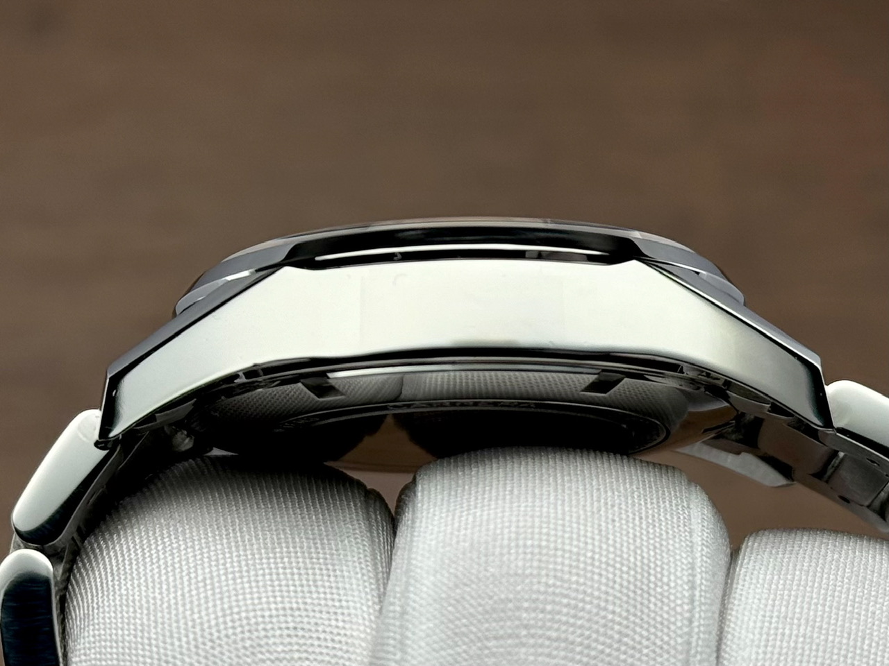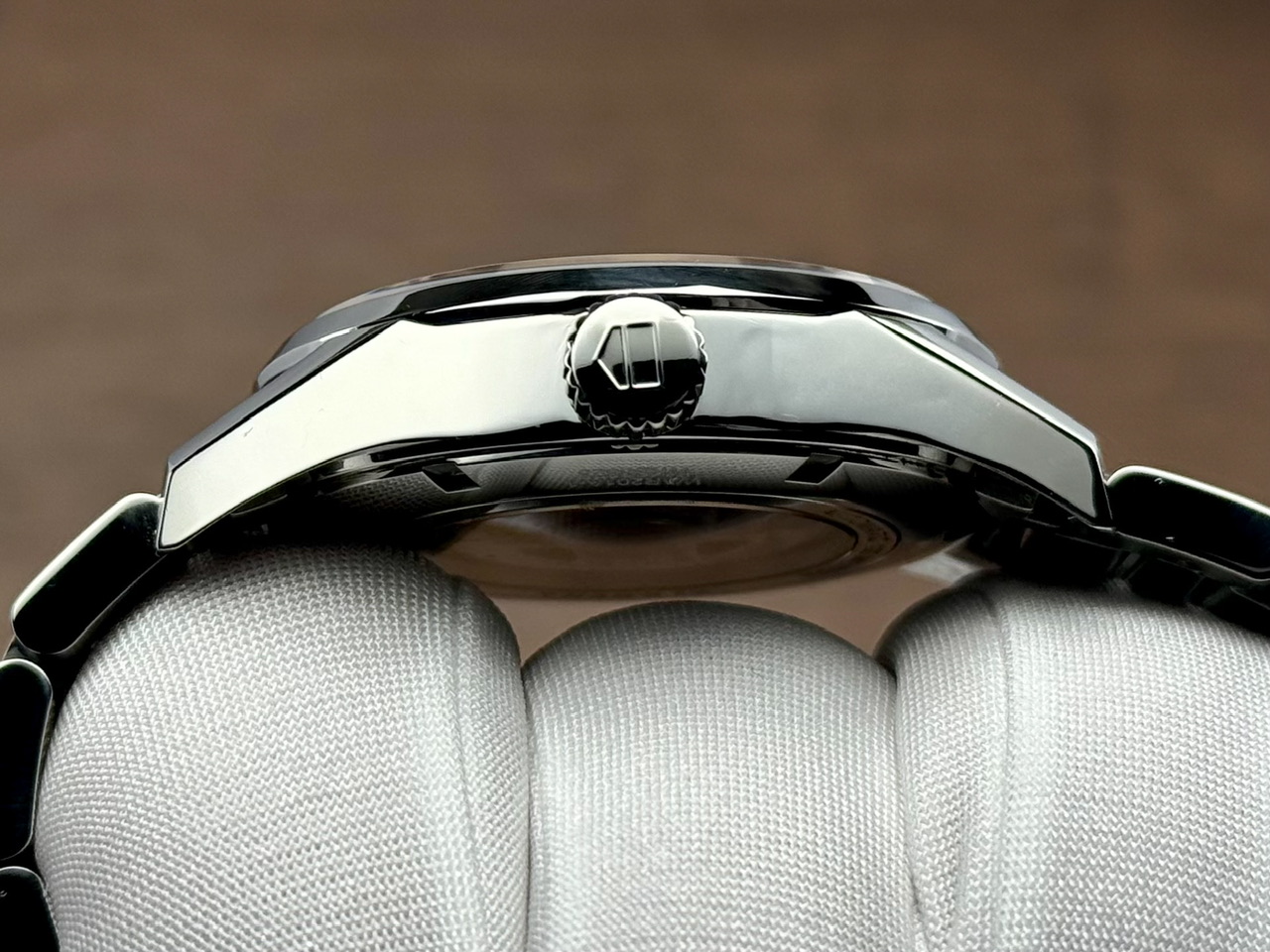 Piękna czarna tarcza z centrycznym giloszem i nakładanymi indeksami. Srebrne wskazówki i indeksy. Dwujęzyczny datownik: angielski i francuski.